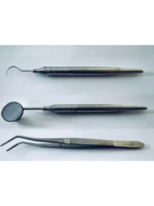 These essential dental tools are designed for precise and efficient oral examinations. The dental mirror provides a clear, accurate reflection, the explorer helps detect caries and surface irregularities, and the tweezer ensures secure handling of small objects.