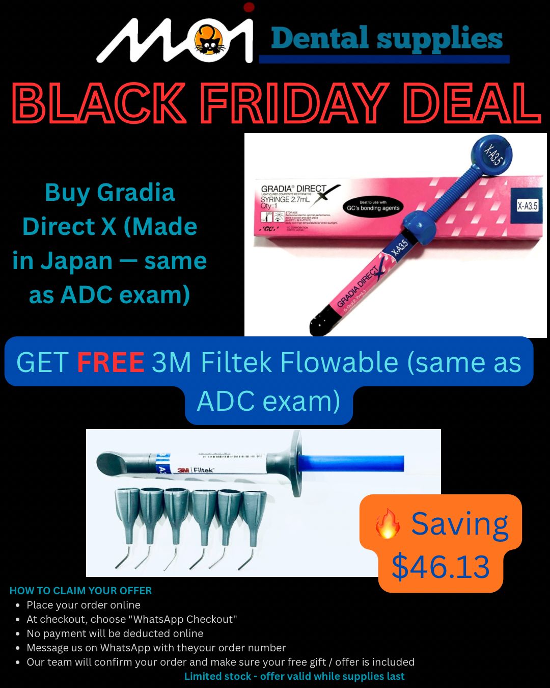 Gradia Direct X (Made in Japan — same as ADC exam)+ FREE 3M Filtek Flowable (A3 or A2 — same as ADC exam