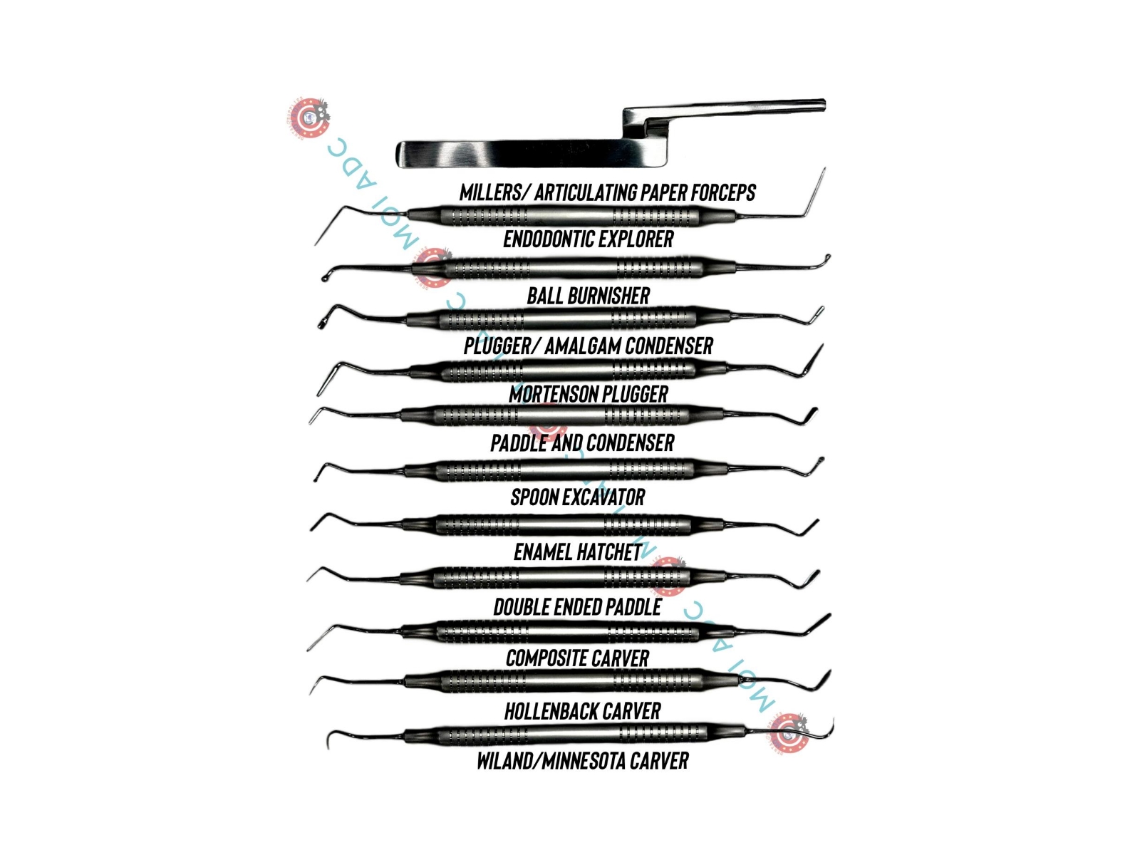 Amalgam carrier (metal), Amalgam carrier (plastic), Amalgam Plugger, Ball Burnisher, Composite Gold Carver, Composite Placement Double Paddle, Composite Placement, Paddle/Condenser, Enamel Hatchet, Excavator, Hollenback Carver, Interproximal Willand / Minnesota Carver – Pink Handle, Interproximal Willand or Minnesota Carver, MILLERS/ ARTICULATING PAPER FORCEPS, MOI Amalgam Well (Stainless Steel with Rubber Base), Mortenson Plugger